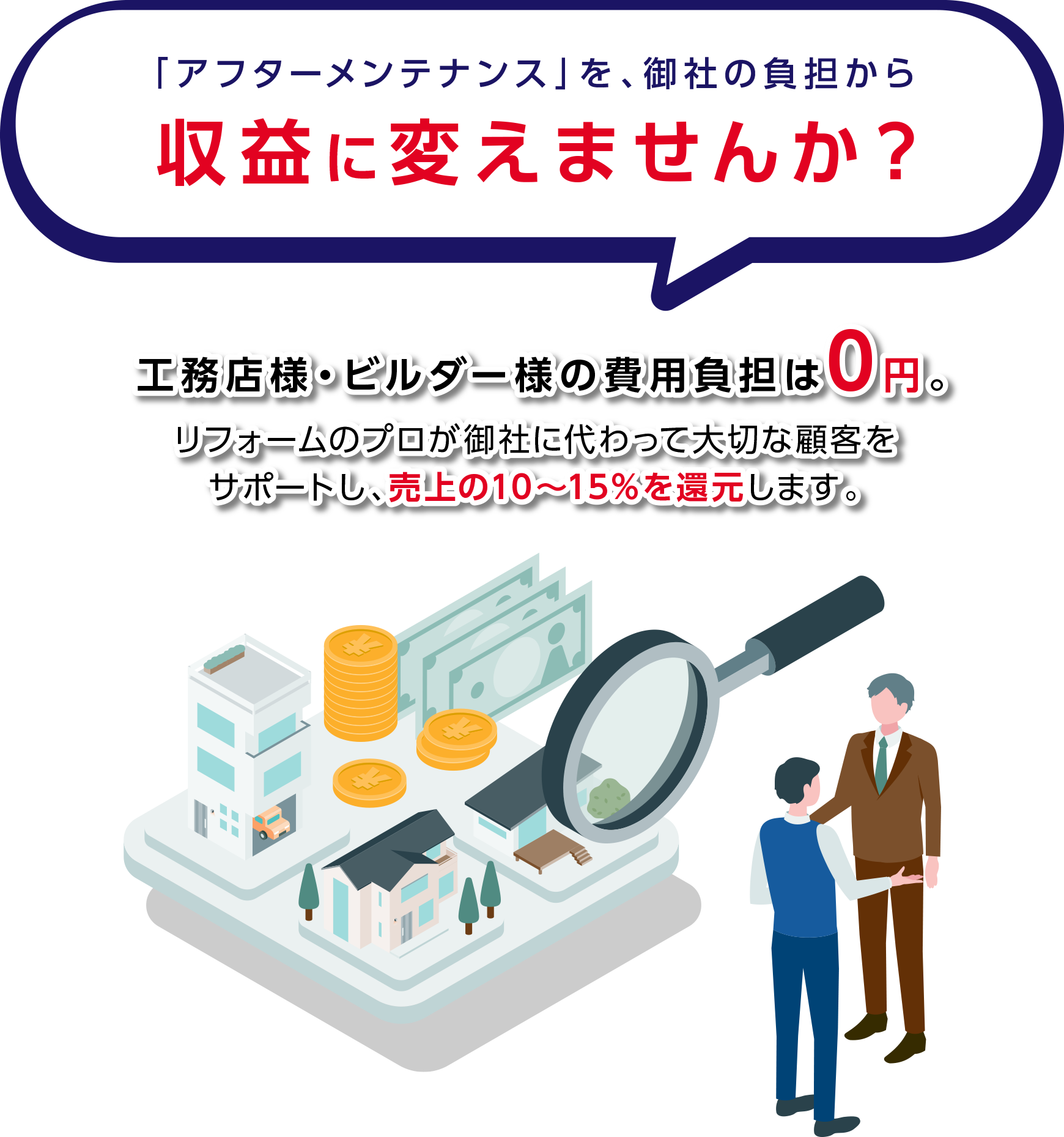 弊社はリフォーム専門会社であり、メンテナンスを入り口としてリフォーム案件を獲得することで収益を得ているため、建元様からの費用は頂いておりません。