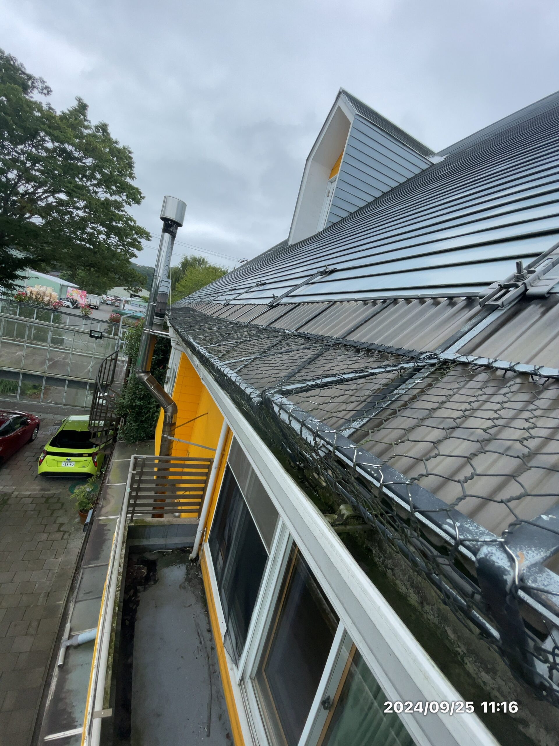 エステネット(墜落防止ネット)を張り、踏み抜き事故を徹底防止。カバー工法で防水と断熱を一気に強化します。